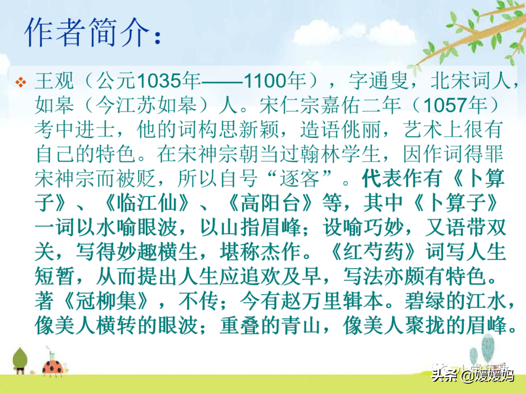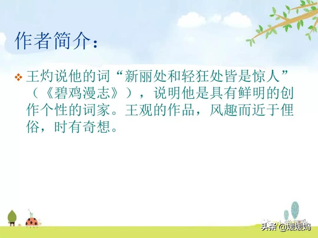 王观(1035—1100),字通叟,如皋( 今属江苏) 人,宋代词人。官至翰林学士。其词构思新颖,用语巧妙,不落俗套。