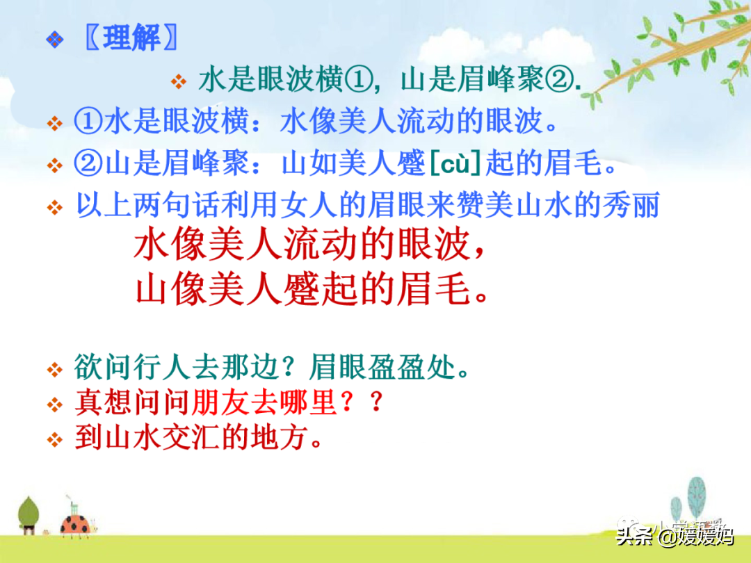 (4)山是眉峰聚:山如美人蹙起的眉毛。《西京杂记》载卓文君容貌姣好,眉色如望远山,时人效画远山眉。后人遂喻美人之眉为远山,这里反用。