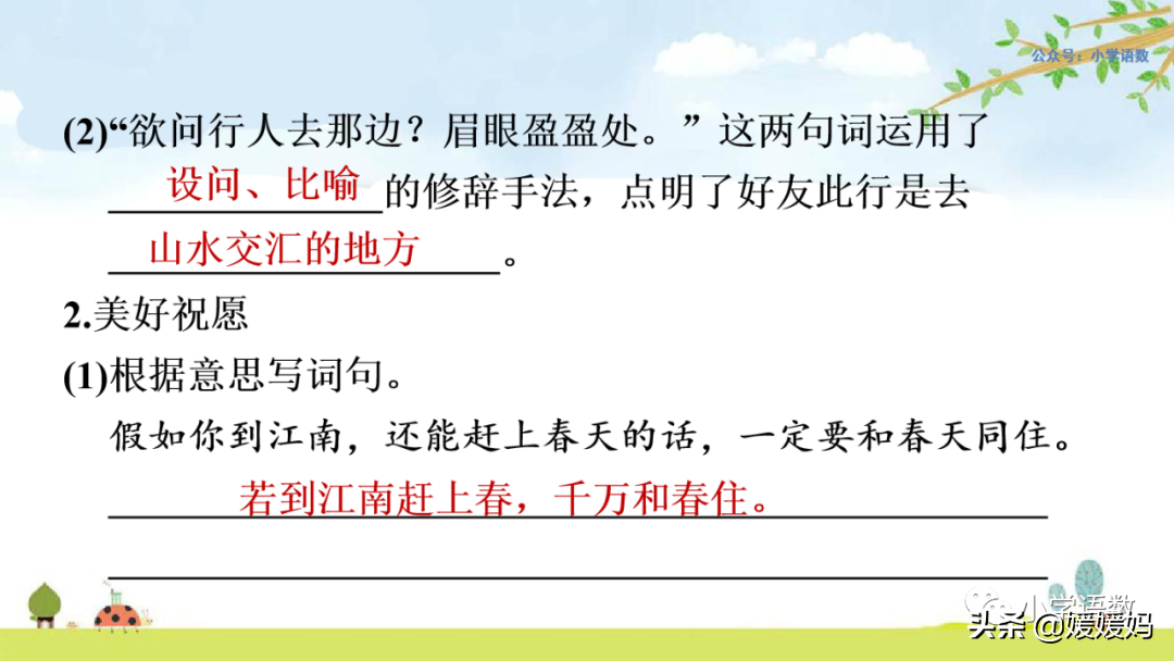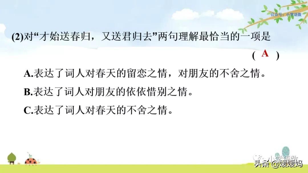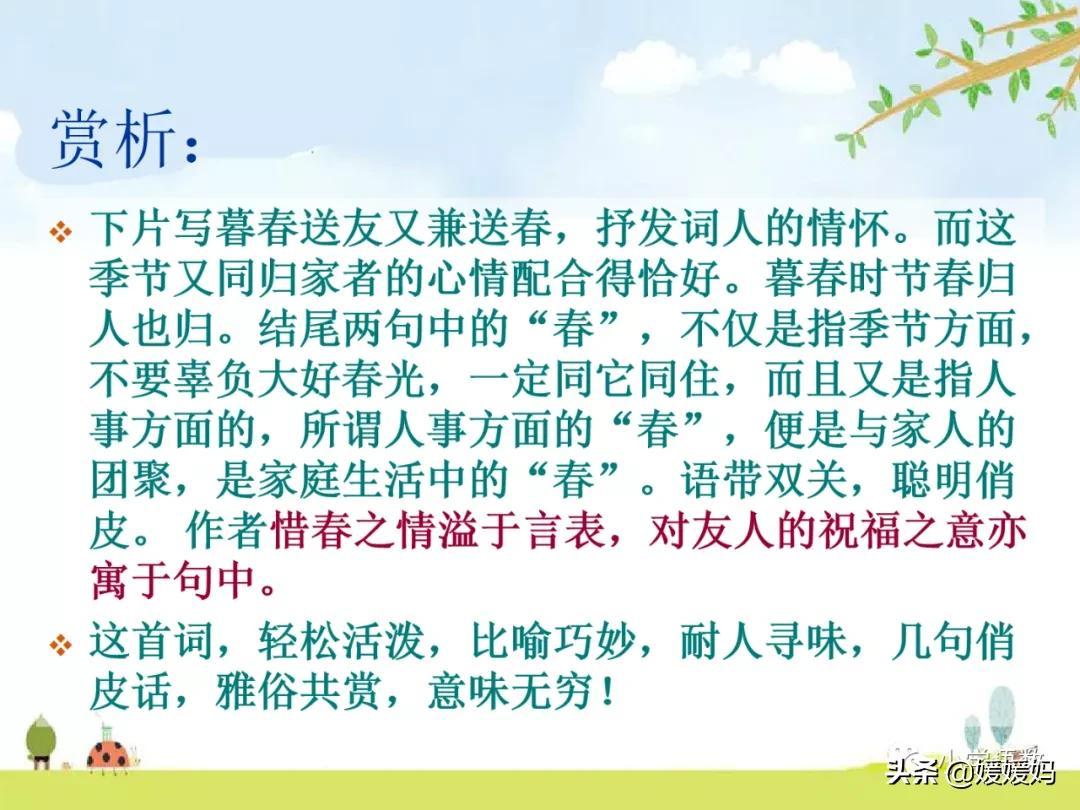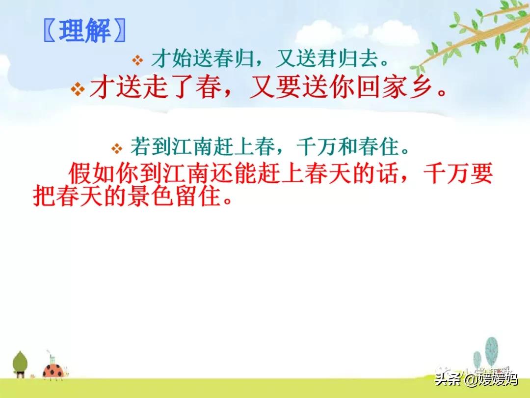 “才始送春归”二句抒写良情别绪:方才“送春”,已是十分怅恨;今又“送君”,更添怅恨十分。旦夕之间,两谙别苦,情何以堪?但作者却故意出以淡语,含而不露。 “若到江南”二句再发奇想,叮嘱友人如能赶上江南春光,务必与春光同驻,惜春之情既溢于言表,对友人的祝福之意亦寓于句中。