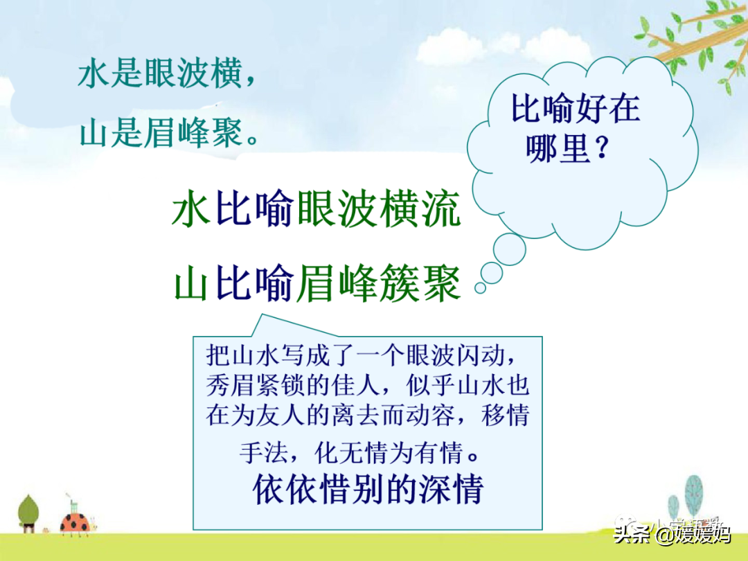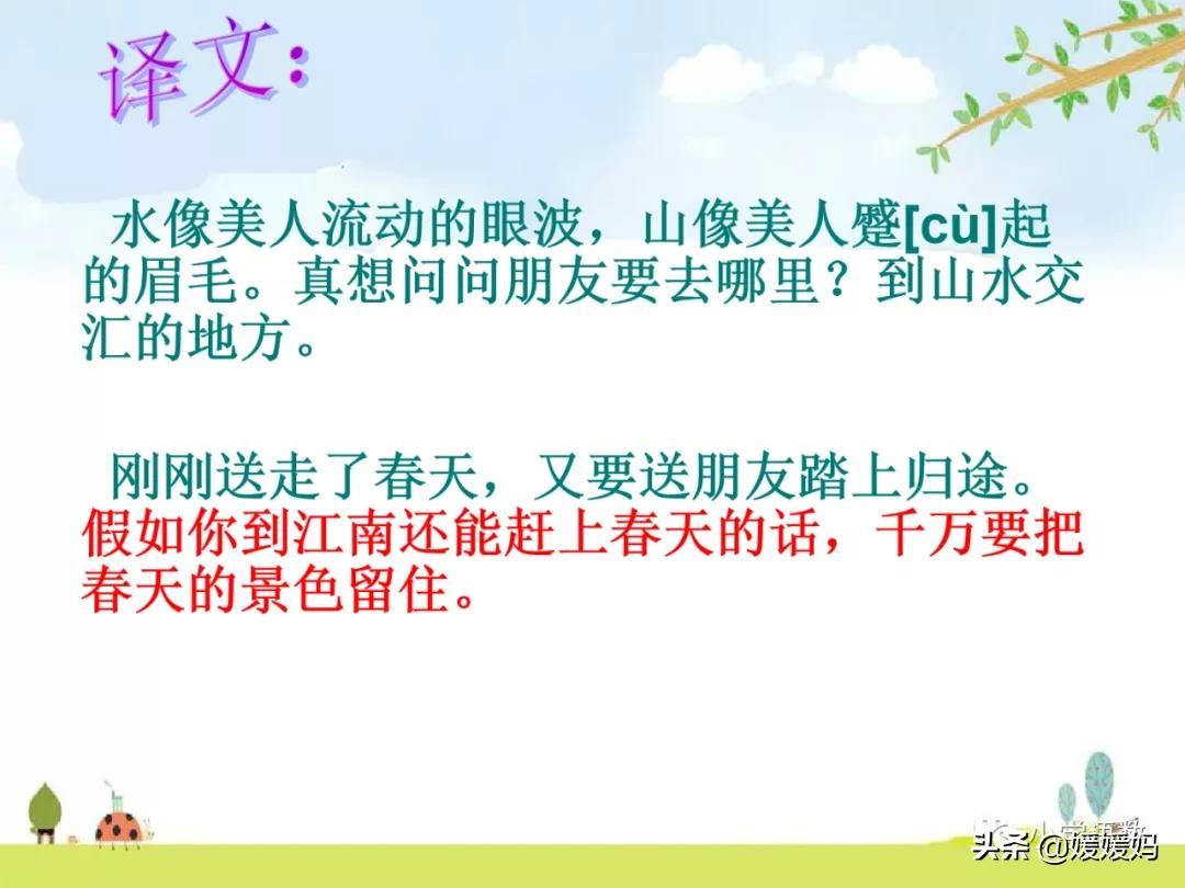 水像美人流动的眼波,山如美人蹙起的眉毛。想问朋友去哪里?到山水交汇的地方。方才送走了春天,又要送你回去。假如你到江南还能赶上春天的话,千万要把春天的景色留住。