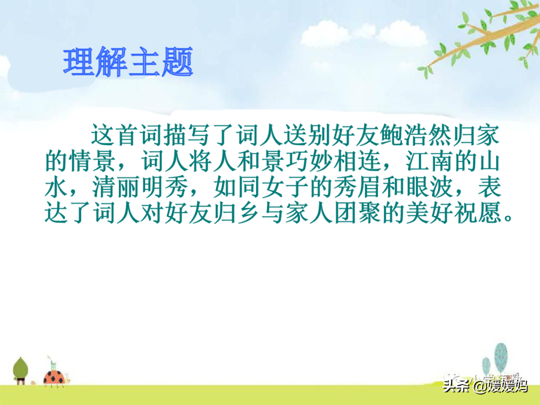 词的上阕写友人一路山水行程,着重写人,起首两句,运用风趣的笔墨,把景语变成情语,把送别时所见自然山水化为有情之物,含蓄地表达了惜别之情。当这位朋友归去的时候,路上的一山一水,对他都显出了特别的感情。那些清澈明亮的江水,仿佛变成了他所想念的人的流动的眼波;而一路上团簇纠结的山峦,也似乎是她们紧蹙[cù]的眉峰了。山水都变成了有感情之物,正因为友人鲍浩然归途中怀着深厚的浓浓感情。
