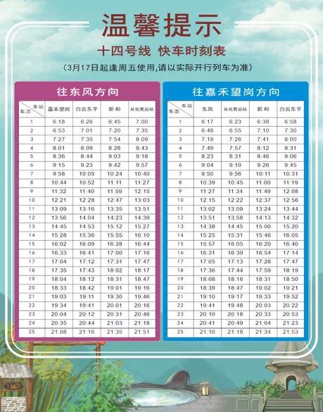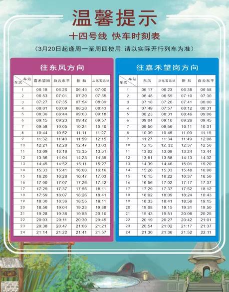 地铁相关负责人表示,十四号线(嘉禾望岗站至东风站)周五晚高峰(16:00—21:30)快车到发时间会根据线路运营组织将有所变化,市民搭地铁时留意车站广播及列车到站信息。