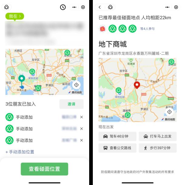 点开“我们哪里见”小程序,输入各自地址,再点击“查看碰面位置”,就能自动生成最佳碰面地点。