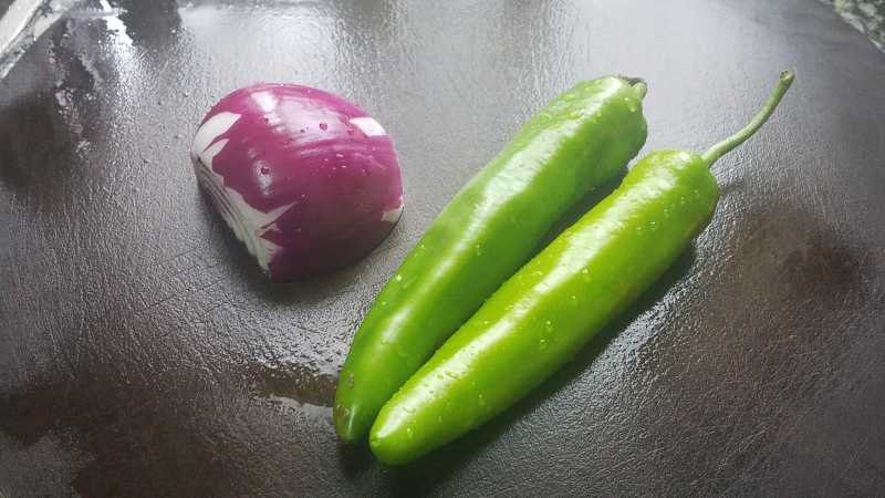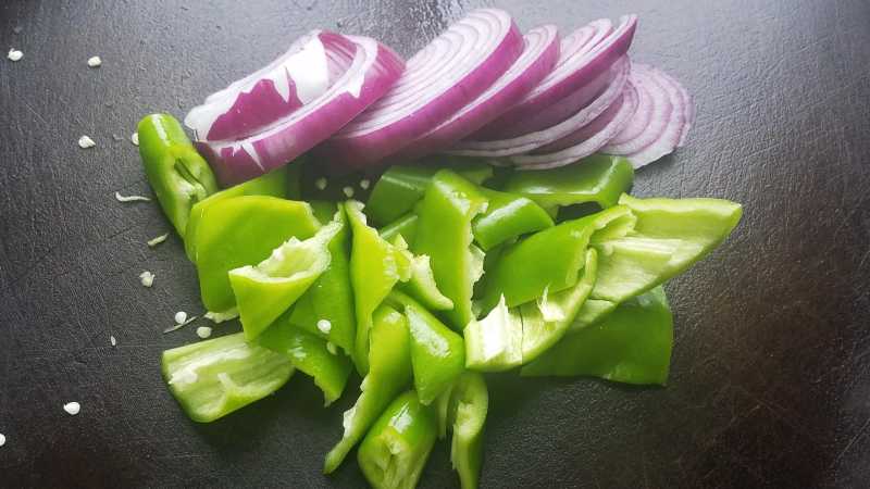 1.到菜市场里买上几条鱿鱼,让老板娘帮忙把鱿鱼切成花刀,拿回家后,把鱿鱼清洗干净备用。准备2个青椒半个洋葱,把它们全都切好备用。