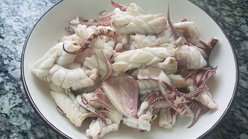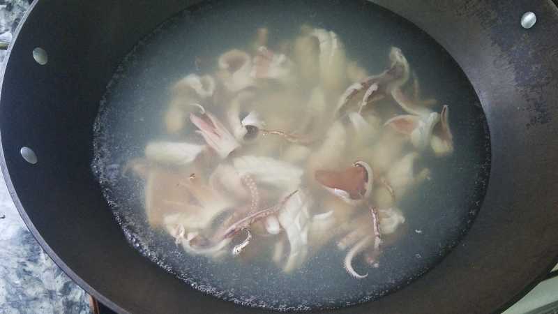 2.锅里放水,把水烧开后,把鱿鱼倒进去,焯一下水,大概焯水15秒左右就可以了,把焯好水的鱿鱼捞出来沥干水分备用。焯水不要太久,不然鱿鱼会比较老,口感不好。