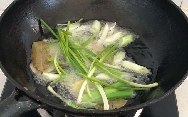 熬制葱油。准备青葱、老葱头、姜片、一个八角、两片香叶、一根大葱,锅烧热后加入食用油,待油温微微热放入所有配料小火慢熬,期间多翻动让受热均匀。炸至葱变焦黄,然后捞出杂质,把熬好的油放凉备用