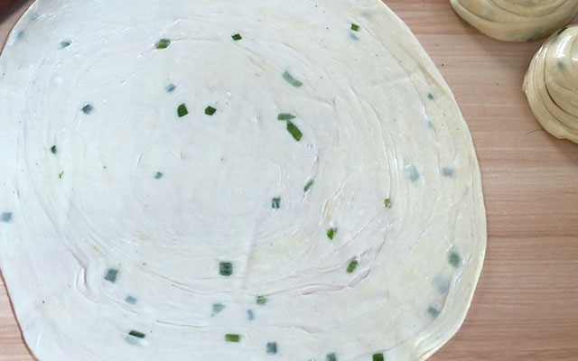 取出休息好的面团,不要揉,整成条切剂子,把剂子拉开后擀薄或者整薄。然后抹上葱油,像折扇子一样折好,再边拉长边卷,最后把尾巴收好。再次松弛10分钟左右