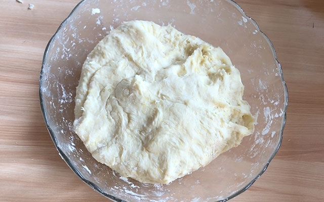 把400克普通面粉放进大碗中,再加入2克盐,打入一个土鸡蛋,稍加搅拌后,加入适量80度的热水和面,搅拌成絮状后,加入15克放凉的熟油,然后揉成团,盖上盖子让面团松弛一个小时。(也可以在碗中抹一层油,这样方便松弛好的面团取出)