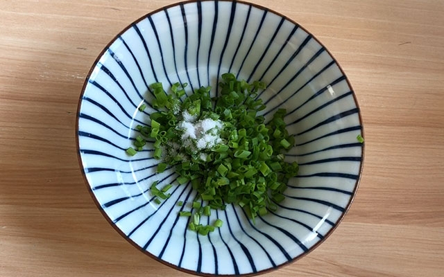 把葱切成葱花,根据个人口味加入少许盐和五香粉,再倒入少许晾凉的葱油,拌匀备用
