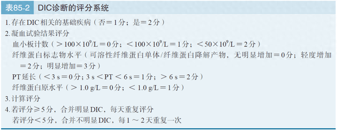 国际血栓与止血协会提出一个简单的评分系统,该系统使用血小板计数、PT、D-二聚体及纤维蛋白原水平作为依据(表85-2)。纤维蛋白原水平通常较高,因为纤维蛋白原是一种急性期蛋白,由于潜在的原因,其水平可能会显著增加。