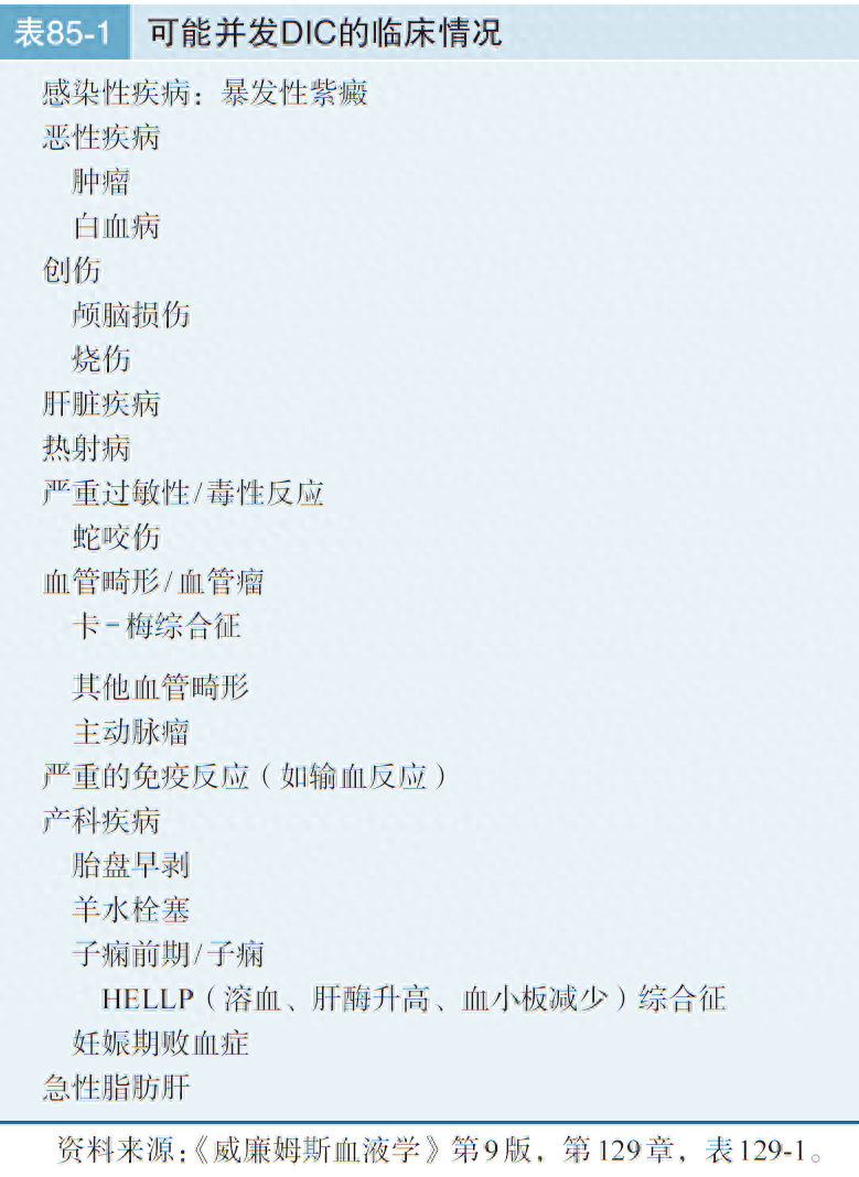 DIC不单独存在,常继发于潜在的病因,表85-1列出了几种最常见的与DIC相关的疾病。