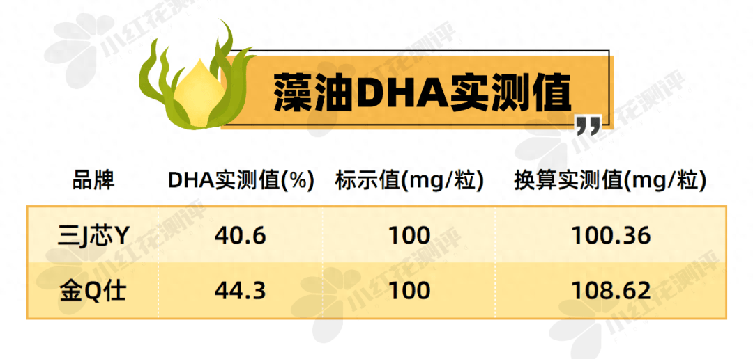 1. 经检测,两款藻油的DHA浓度都达到了40%以上,换算每粒DHA含量均接近标示值,其中