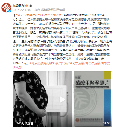 药店误卖禁用药致38岁产妇流产,辩称以为是保胎药,法院判赔4.3万
