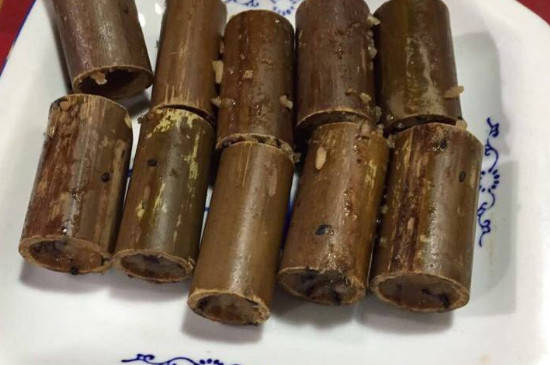 竹筒粽子粘竹筒可以在大米装入竹筒之前掺入一些食用油,也可以在大米装入竹筒后,用筷子在中间搅一个孔并放入长条形肥瘦适中的猪肉,这样既可以避免粽子粘竹筒,也可以让煮出来的竹筒粽子的味道更好。