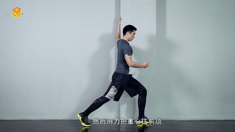 首先侧面墙大小臂90度,把左手小臂放到墙面上,左脚往前迈,然后用力把重心往前顶,然后头部向右侧旋转最大幅度,慢慢回来。