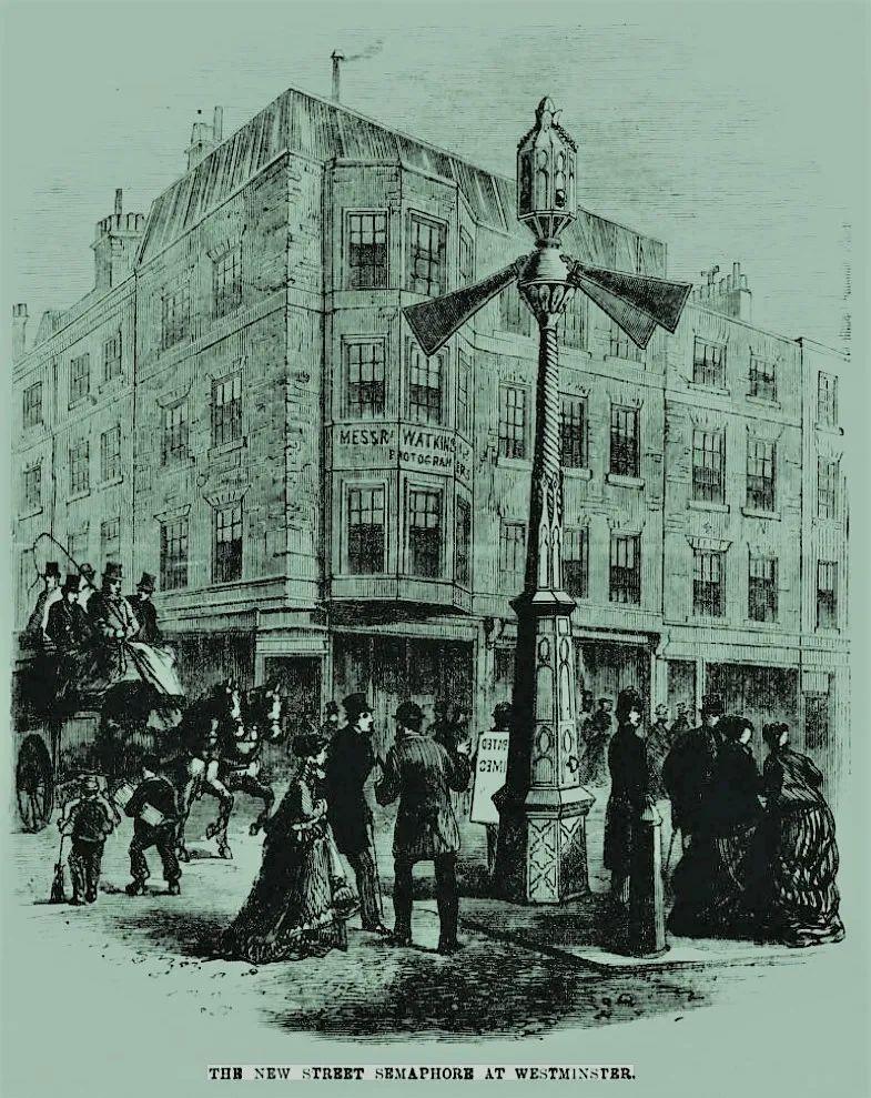 该交通信号灯高 6.7 米,由两个连接到旋转臂上的移动标志,以及夜晚使用的柱顶上的煤气灯组成。当时,并没有“自动化”这一概念,所以交通信号灯的变化全是人为操纵的。