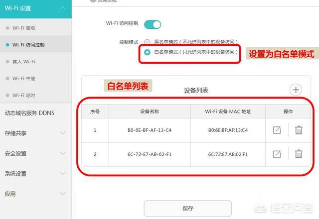 如果发现了可疑的终端,那么可以对其进行限速,或者直接禁止其使用网络。有些路由器称为白名单或者黑名单功能,两个功能不能同时使用。白名单开启时,只有白名单里的终端可以连接到该路由器,除此之外无法连接;黑名单开启时,黑名单里的终端无法连接到该路由器,其他终端可以连接。如下图所示▼。