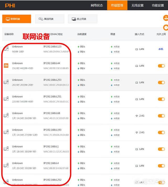 使用路由器背面标签的用户名和密码登陆自家的无线路由器,进入管理界面,选择【终端管理】,就可以看到无线路由器的联网设备,通常情况下路由器会根据终端的MAC地址识别设备的类型,用户根据这些信息发现【可疑终端】,如下图所示▼。