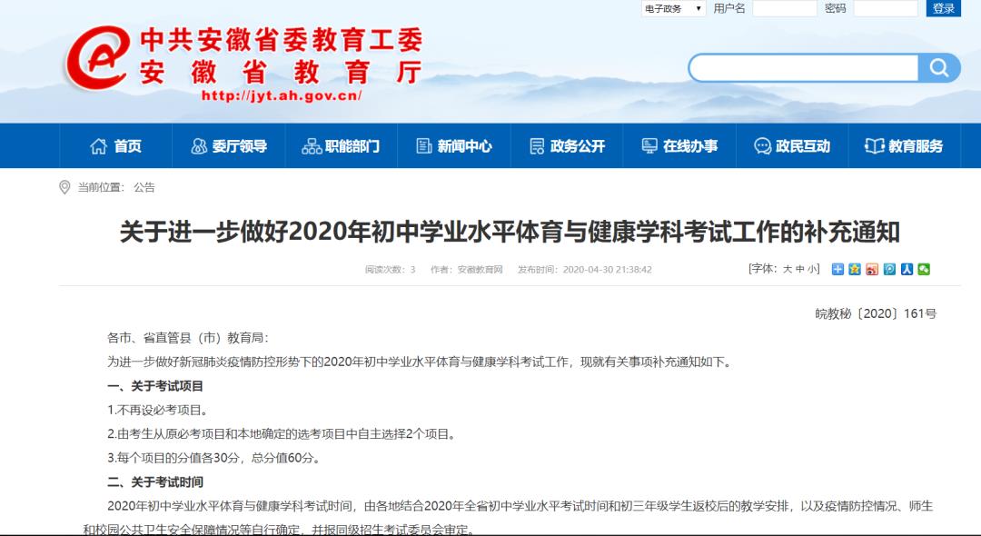 1.除上述政策外,《安徽省教育厅关于做好2020年初中学业水平体育与健康学科考试工作的通知》(皖教秘〔2020〕10号)中的其他政策规定不变。