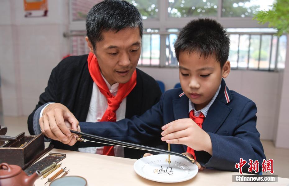 9月1日,非遗传承人带领小学生体验“锔瓷”技艺。当日,山东济南13位非物质文化遗产传承人走进济南科苑小学为小学生们上开学第一课。 中新社记者 张勇 摄