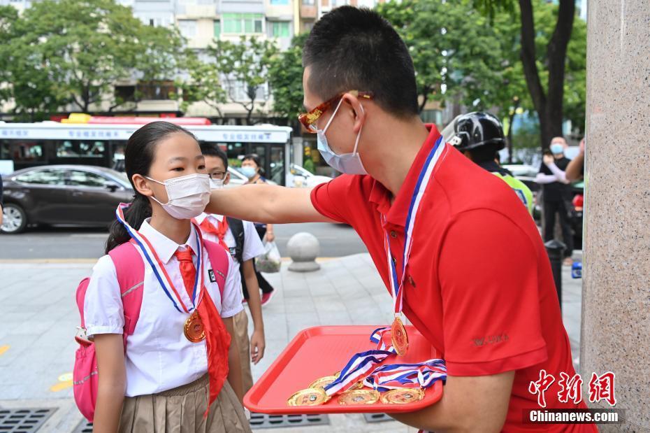 9月1日,广东省广州市,东风东路小学老师为进入校园的学生佩戴“金牌”。当日,广州各中小学迎秋季开学。 中新社记者 陈骥旻 摄