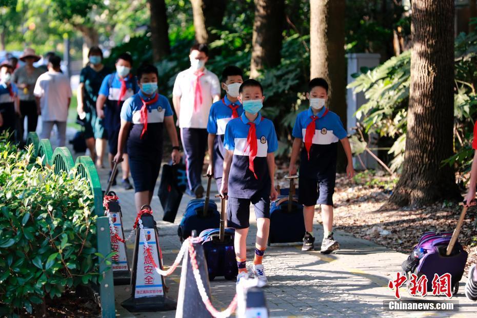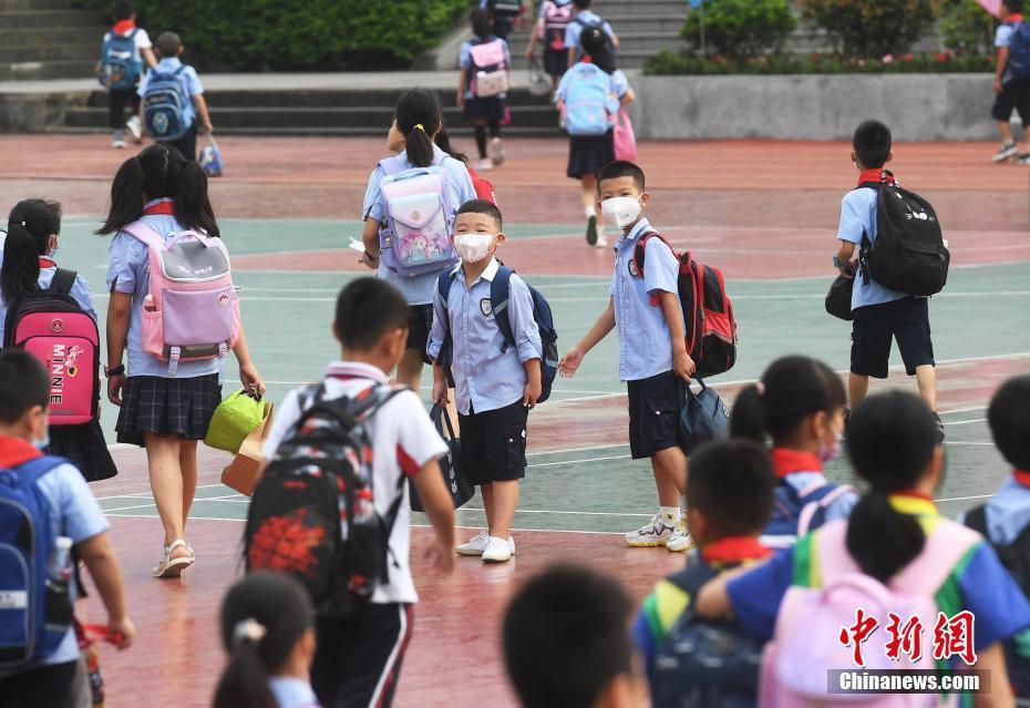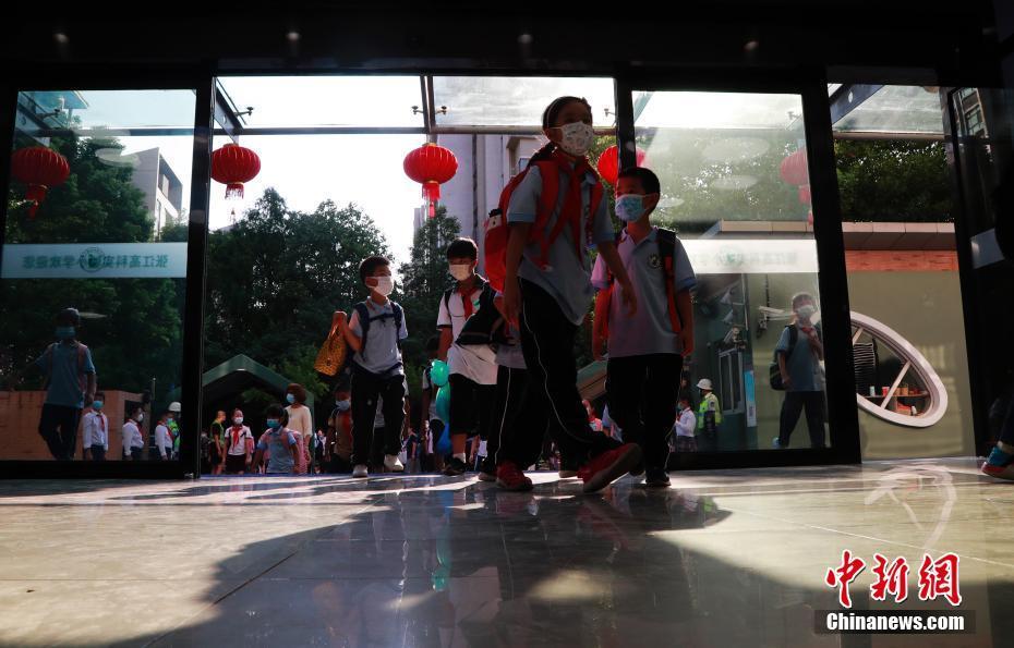 9月1日,重庆市渝北区回兴小学的学生们戴着口罩进入校园。当日,重庆小学正式开学。 陈超 摄