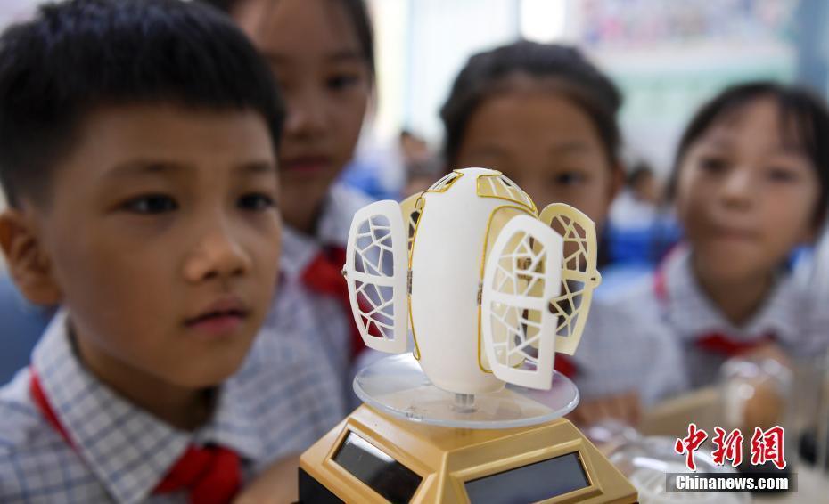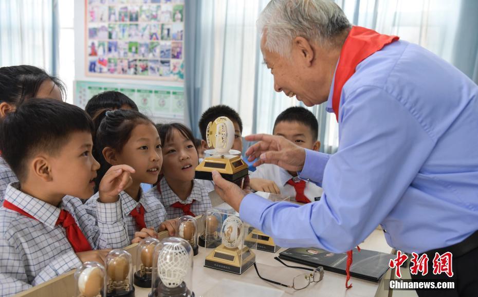 9月1日,小学生们观看非遗传承人制作的蛋雕作品。当日,山东济南13位非物质文化遗产传承人走进济南科苑小学为小学生们上开学第一课。 中新社记者 张勇 摄