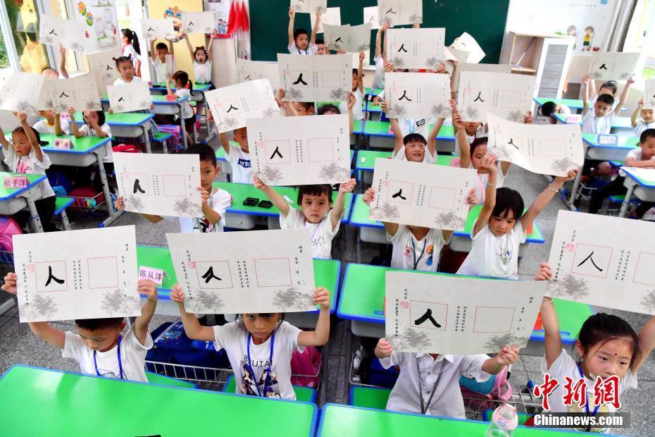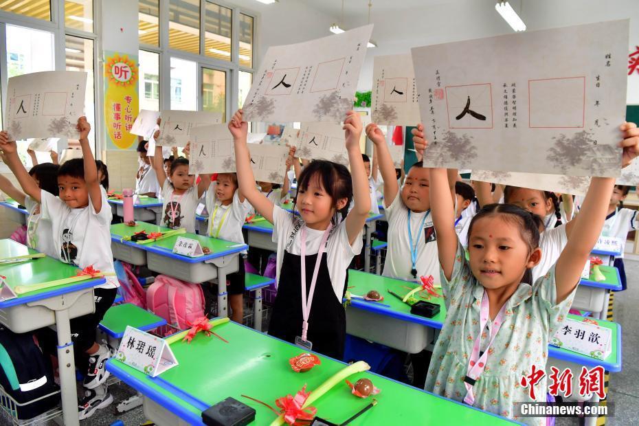 图为9月1日,福州市仓山区第六中心小学一年级新生展示自己书写的“人”字。 张斌 摄