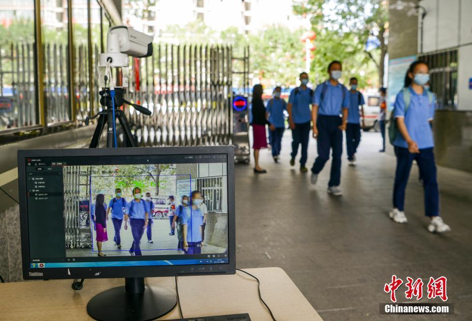 9月1日,新疆乌鲁木齐市第四中学,学校出入口设置红外线测温仪,对进入校园的学生进行测温。当天,该市初三及高三年级正式开学。 中新社记者 刘新 摄