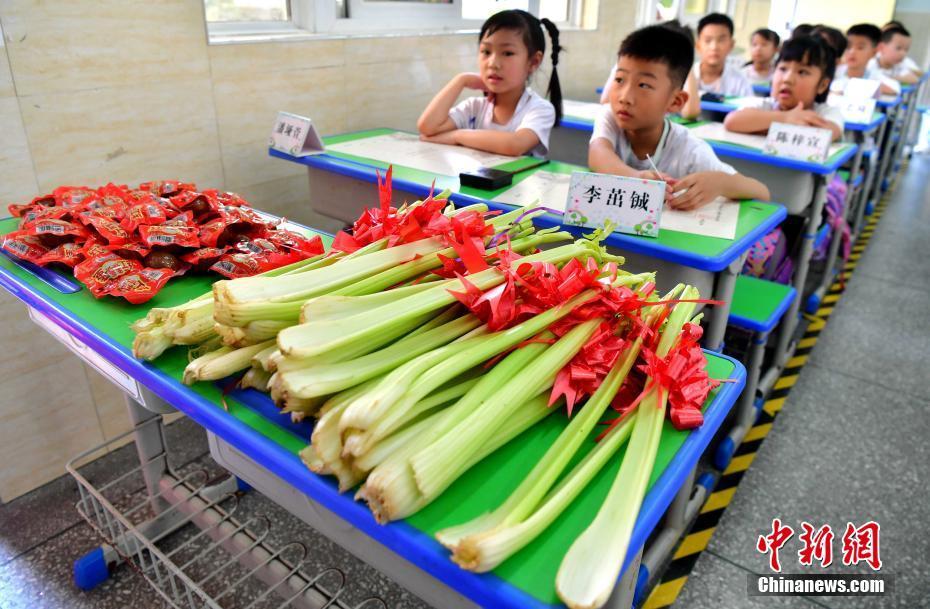图为9月1日,福州市仓山区第六中心小学在“开笔礼”上为一年级新生准备的芹菜和蛋。 张斌 摄