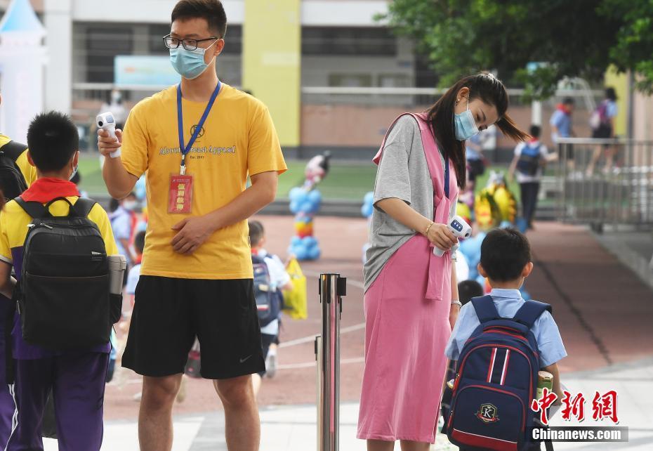 9月1日,重庆市渝北区回兴小学的学生们戴着口罩进入校园,值班老师在校门处依次为学生测量体温。当日,重庆小学正式开学。 中新社记者 陈超 摄
