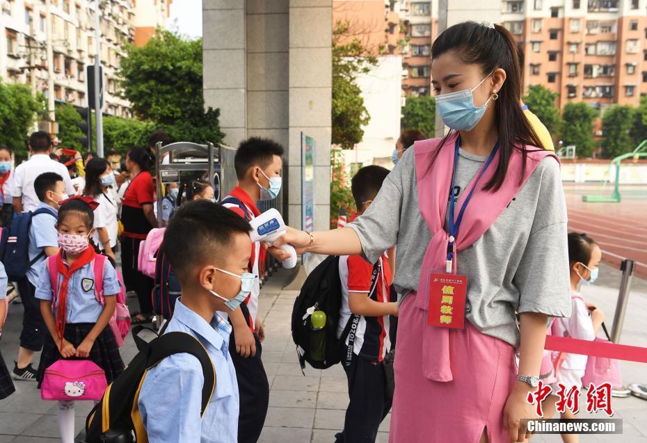 9月1日,重庆市渝北区回兴小学的学生们戴着口罩进入校园,值班老师在校门处依次为学生测量体温。当日,重庆小学正式开学。陈超 摄