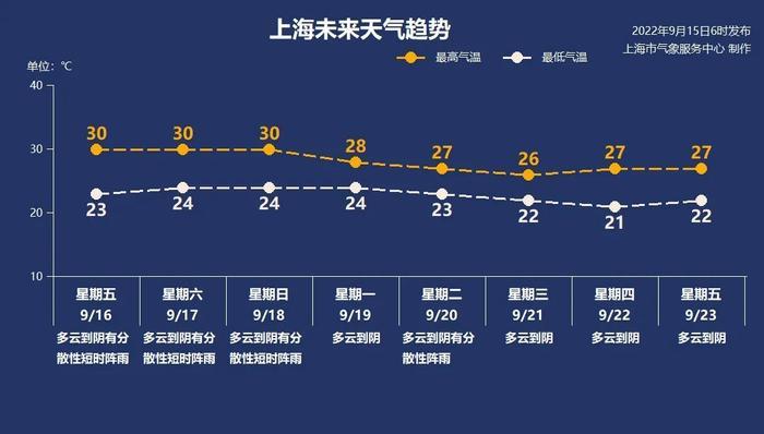 9月16日(周五):多云到阴有分散性短时阵雨,22~30℃