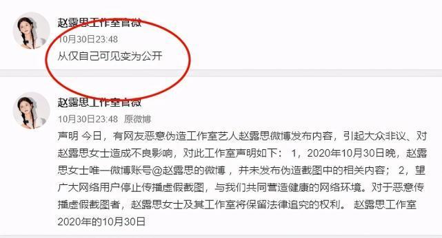赵露思工作室火速澄清,表示网友恶意伪造赵露思的微博发布内容,对赵露思造成了不良影响,声明赵露思在30日当晚,并没有发布任何截图中的相关内容,并且会保留法律追究的权利,引起大众讨论。
