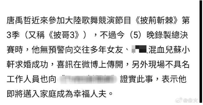 11月5日,台媒证实了唐禹哲求婚成功,并称不是提前安排的,而是突发的,唐禹哲在其他哥哥拱求下,自己也决定在其他哥哥的见证下,迈入人生下一个阶段,所以节目组和亲友团也都很意外,而且求婚的戒指还是用的林志颖的,求婚过程也是在现场投票结束之后,不会影响结果。