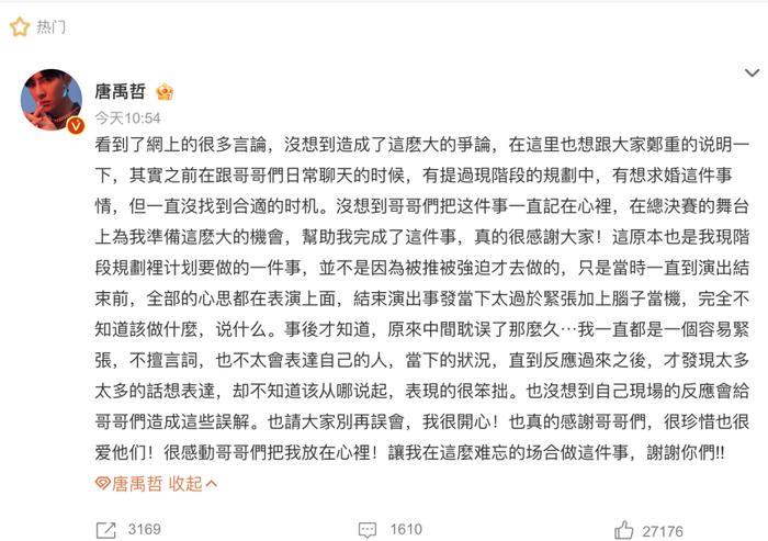 有不少网友认为,唐禹哲是故意安排求婚,来抢总决赛的出道席位。
