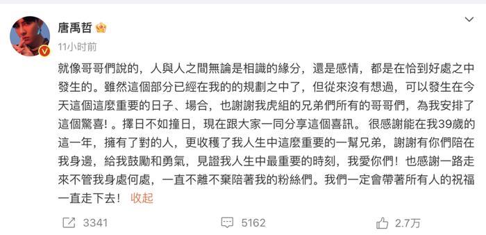 11月6日凌晨,唐禹哲发文宣布喜讯,又在几小时后回复争议。