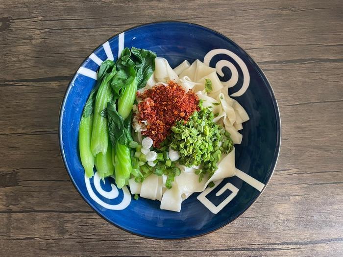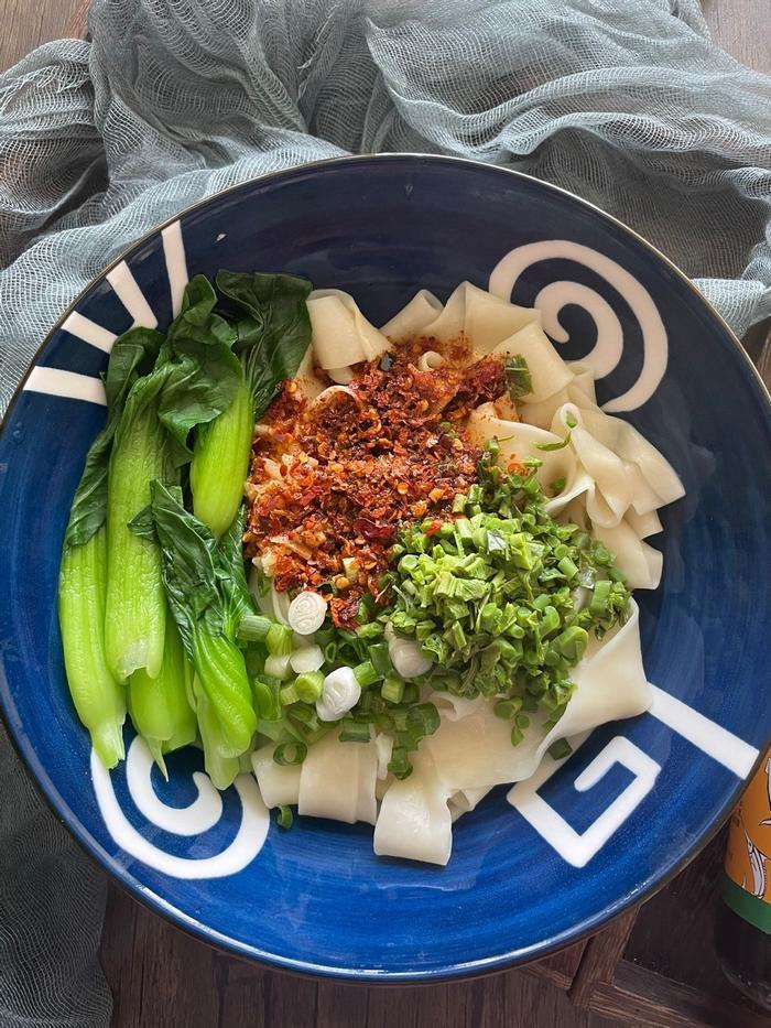 【所需材料】:鲜面条200克,香椿芽1小把,调味汁1勺,醋1勺,青菜3颗,小葱1根,蒜1瓣,盐1小勺,调味料1小勺,辣椒面。