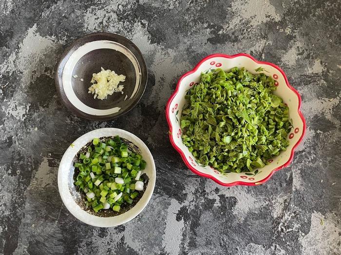 步骤三、接下来把洗好的香椿弄干水,切碎备用,小葱和蒜也要切碎备用。