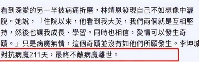 最后,李坤成患上了癌症,健康状况日益恶化。在他生病期间,林金根不知疲倦地照顾着他。最终因病去世。