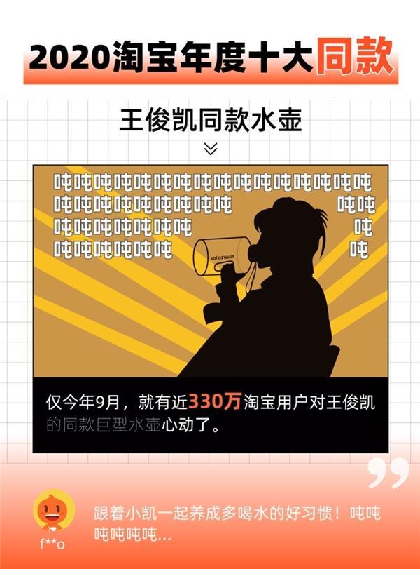淘宝的年度十大同款榜单数据显示,今年平均每天有8万人来淘宝搜王一博同款斜挎包,青春有你2里的“淡黄的长裙”也在搜索框里出现了3000万次。王俊凯用喝水带火了水壶,仅仅9月,就有330万人来搜王俊凯的同款水壶,粉丝们一边搜一边说“要和三字弟弟一样,养成喝水的好习惯”。