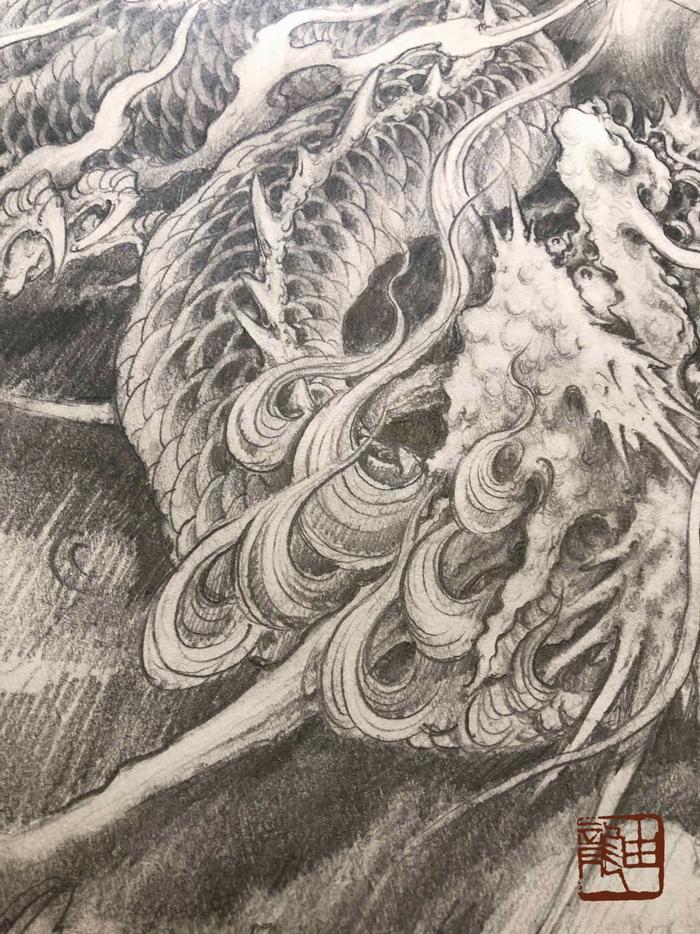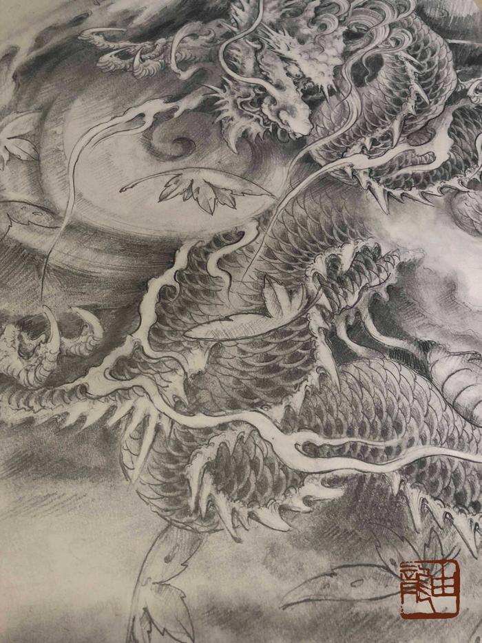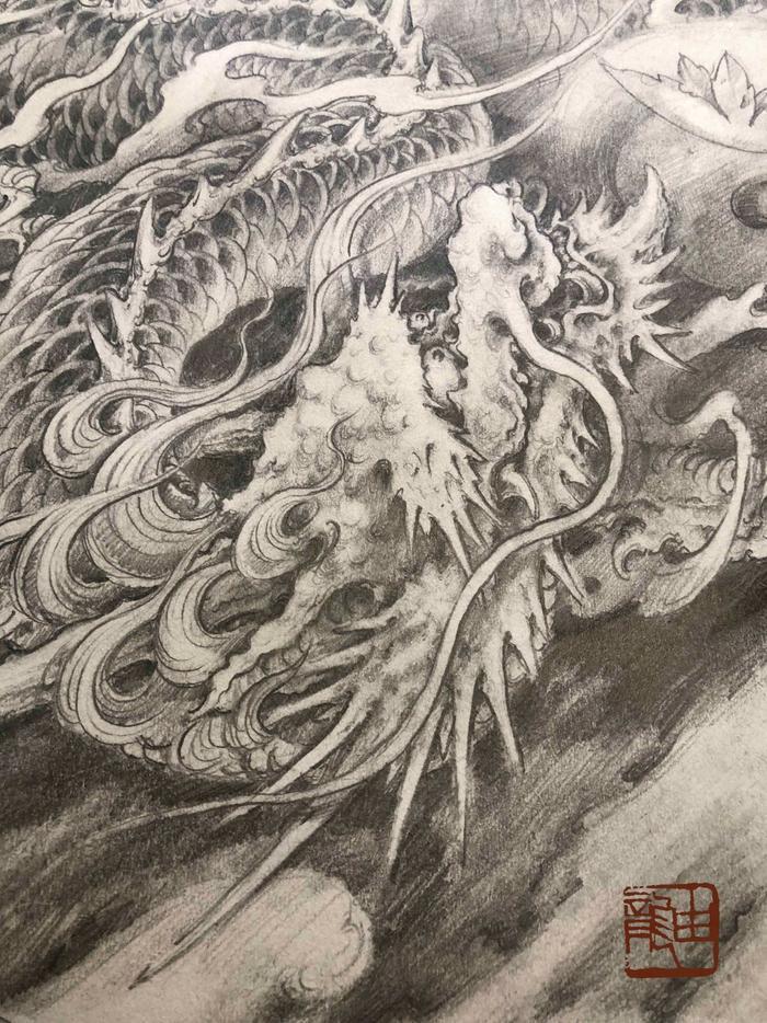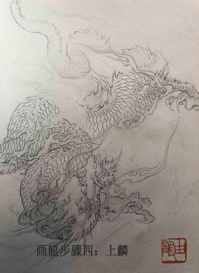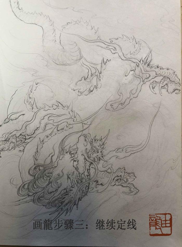3. 墨线描绘:用铅笔或者炭笔沿着形状和细节的边缘描绘龙的轮廓线,这些轮廓线可以帮助我们更好地构建龙的形态和轮廓。