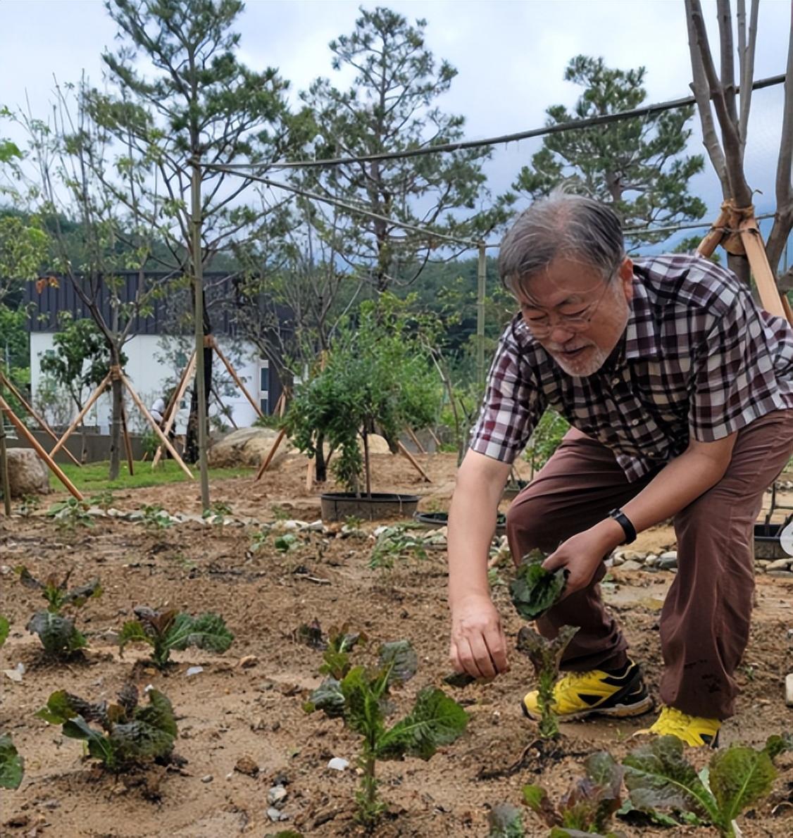 他穿着普通的衣服,经常独自在乡间遛猫狗、种菜,俨然一副农家翁的模样。看得出来,文在寅很享受这种田园生活。
