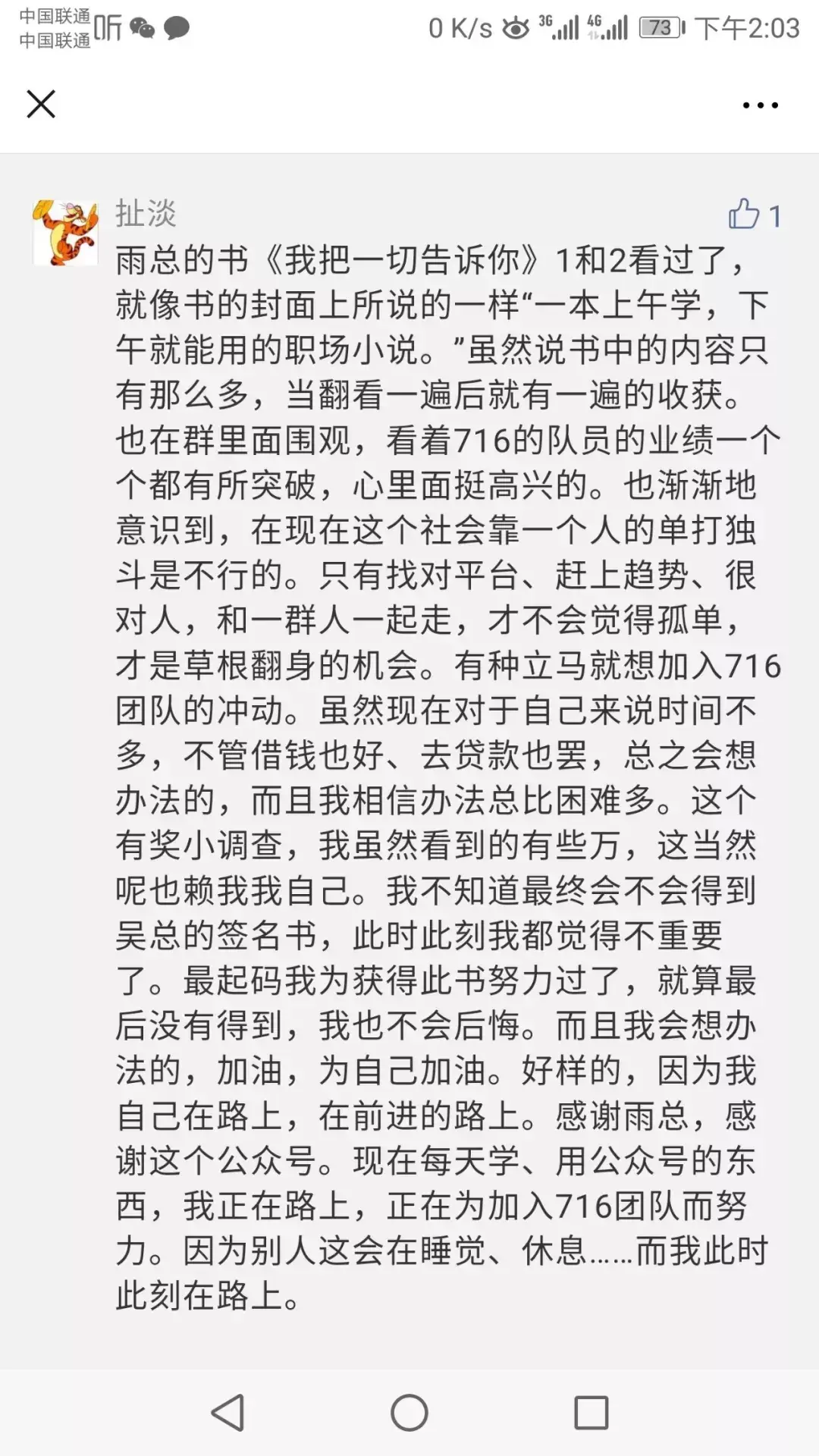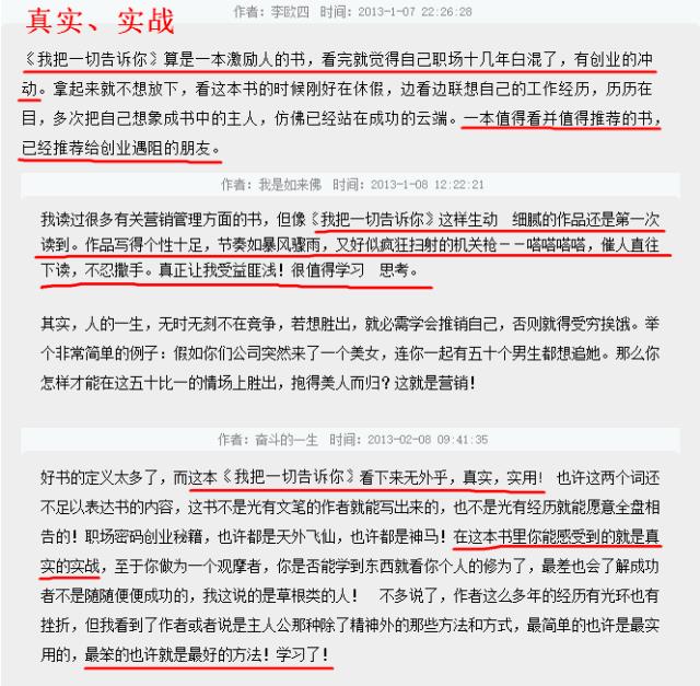 ◇结论:《我把一切告诉你》是一本十年一遇的商战小说,99.7%的天涯贴友疯狂学习,亲身实践,正一步步体验成功。