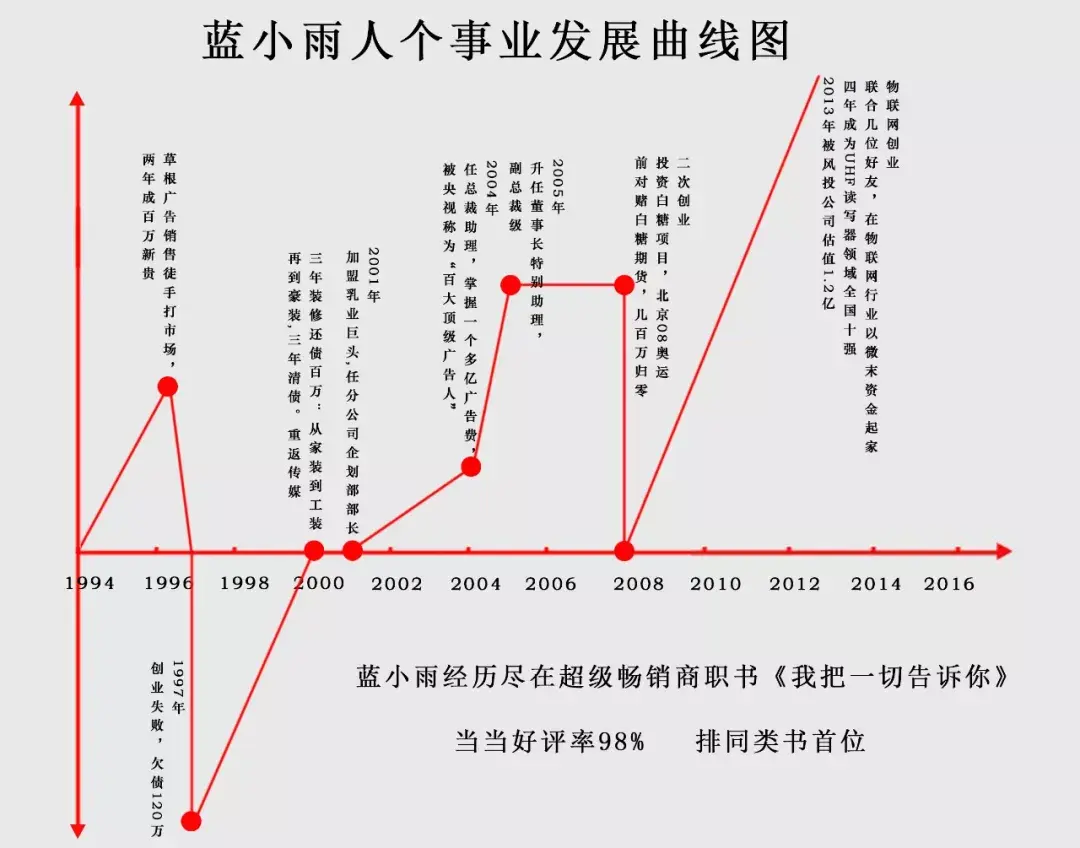 蓝小雨业务员出道,销售界征战20年,丰富的销售、策划实战经验。是横跨广告业、装修业、快消品业的销售、策划顶级高手。