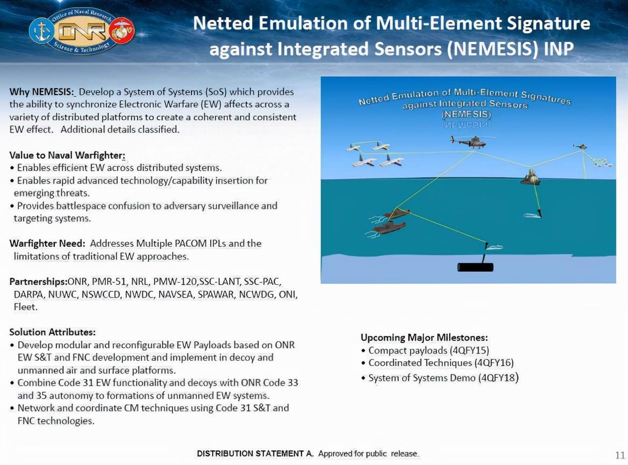 装备了这些系统的“蛇头”潜航器有可能成为美国海军秘密电子战生态系统的一部分,该生态系统被称为针对综合传感器的多要素特征网络化模拟(NEMESIS)。NEMESIS的目标是开发一个“系统体系”,使用高度网络化的有人和无人飞机、船只和潜艇,在广阔的地理区域对不同的敌人传感器执行高度协调的电子攻击和诱饵行动,甚至创建“幻影舰队”来迷惑和分散对手的注意力。