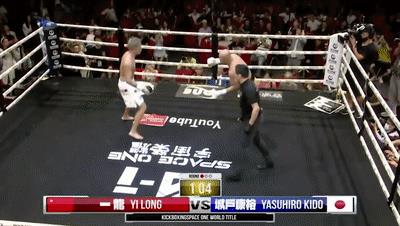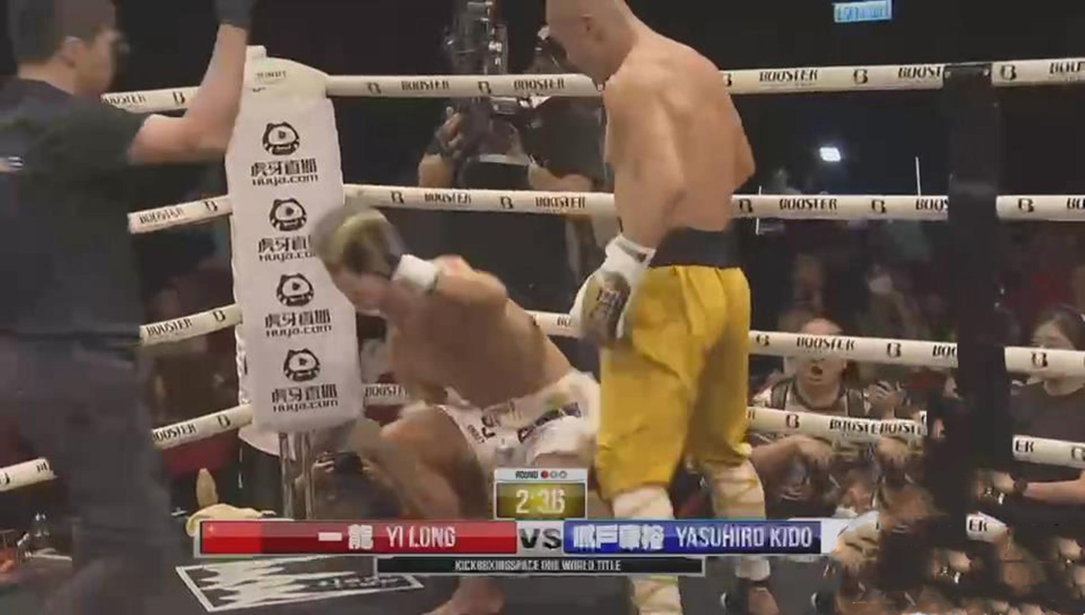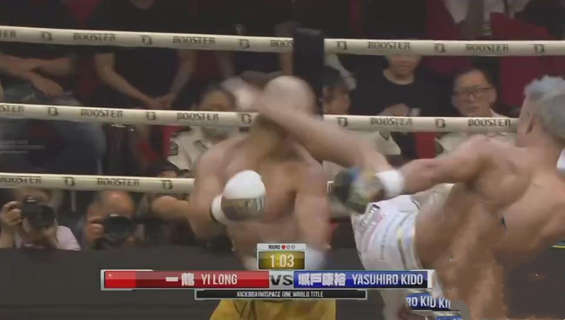 城户康裕的拳法赶不上一龙,一龙每次组合拳进攻,他都靠搂抱化解,但是他的腿法却很犀利。在比赛进行到1分多钟的时候,两个人经历短暂的场面沉寂,城户康裕突然打出一记右腿的高扫,此时一龙也正好要来一记转身鞭拳,结果两个动作交叉在一起了,城户康裕的腿法更快一些,一龙的转身鞭拳稍慢,一龙的头部在身体有些转身的时候,挨到了一记致命的高扫。