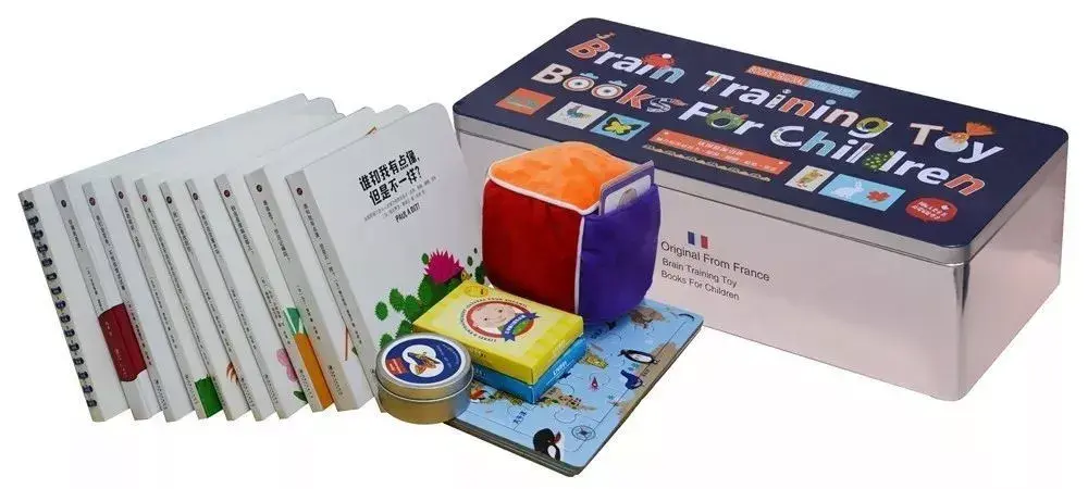 一个精美的大铁盒、里头装着10本形式、内容、功用完全不同的绘本以及6种配套锻炼玩具(含桌游),自己用收纳方便,送礼也特别合适,因为铁盒装真的足够精美。