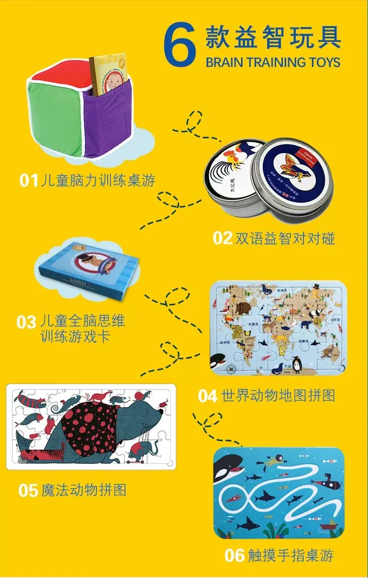 这套铁盒绘本套装里还有6款非常有趣的玩具,比如彩虹骰子桌游,智力对对碰,平时外出就可以给孩子带着随时开发智力,真的太划算了。