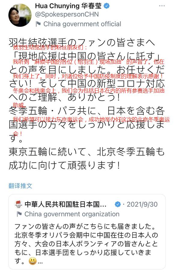 随后,中国外交部发言人华春莹女士也转发了大使馆推文,回复了日本冰迷的疑问。